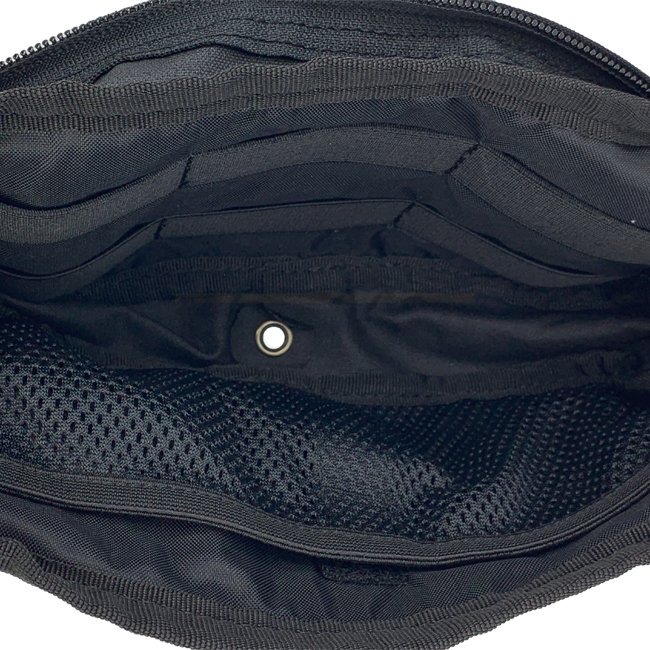 Die Horizontal Utility Pouch Medium verfügt aussen über eine MOLLE System Oberfläche sowie zwei Streifen Klett für Patches. Innen finden sich auf der einen Seite zwei übereinander verlaufende Reihen mit elastischen Schlaufen und auf der anderen eine Netztasche, die sich mittels Klett vertikal unterteilen lässt. Damit lässt sich eine ganze Menge Zubehör sicher verstauen.