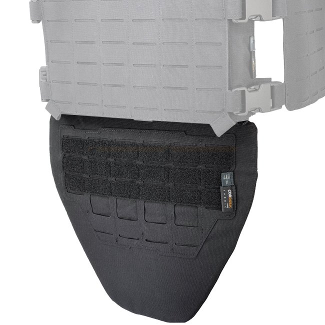 Der Pitchfork Large Groin Protector - Schwarz erweitert den Schutzbereich einer Kampfweste. Verfügt über einen Klettverschluss zum Einlegen eines ballistischen Schutzes gegen Handfeuerwaffenkaliber. Vorderes MOLLE-System zum Anbringen von Ausrüstung. Ergo