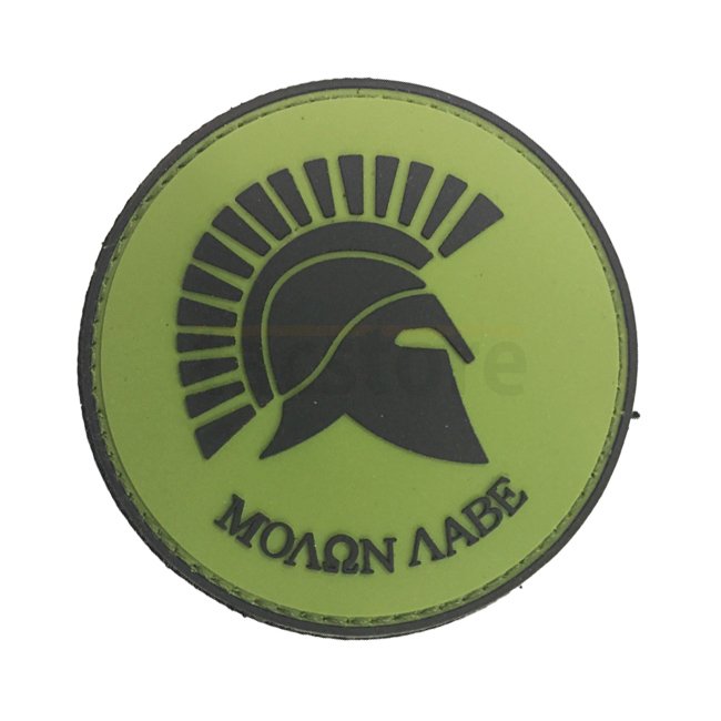 Aufnäher mit einem grünen Pitchfork Molon Labe Design und den Abmessungen 70 x 70mm.