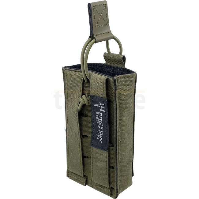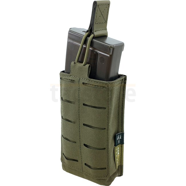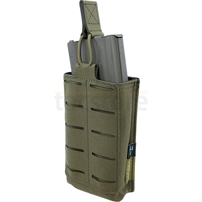 Die Open Single Rifle Magazine Pouch nimmt alle gängigen 5.56 / .223 Langwaffen Magazine auf, auch SIG und AK47/74 Magazine passen perfekt (G36 Magazine passen nicht). Die aus hoch-widerstandsfähigem sowie leicht elastischem Hypalon gefertigte Zuglasche ist längenverstellbar. Für einen besseren Halt ist das Innere der Tasche mit einem anti-rutsch Material ausgekleidet. Die Front weist eine MOLLE System basierende Laser Cut Oberfläche auf, die der Montage von weiteren Taschen dient.