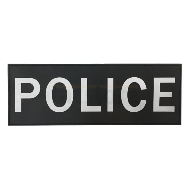 Mistgabel Polizei Aufnäher - Groß: Weiß auf schwarzem Gummi-Aufnäher mit Klettverschluss. Abmessungen 90x250mm.