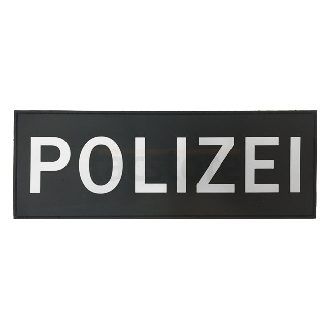 Mistgabel Polizei Aufnäher - Groß: Weiß auf schwarzem Gummi-Aufnäher mit Klettverschluss, 90 x 250mm.