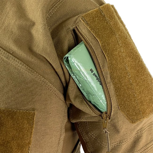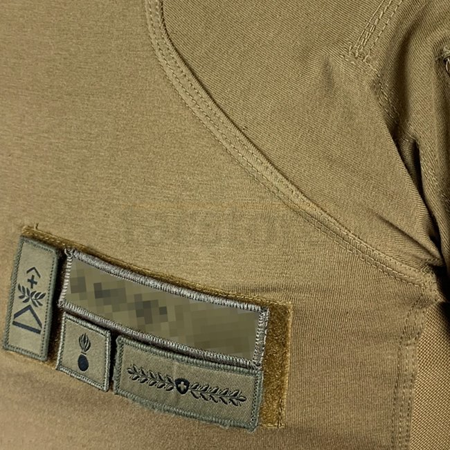 Auf den Seiten sowie unter den Armen weist es ein leichtes, weiches und luftdurchlässiges Maschengewebe auf, welches für die nötige Kühlung in heissen Situationen sorgt. Ebenfalls auf den Seiten finden sich beidseitig Taschen für ein Smartphone oder andere flache Gegenstände. Durchführungen ermöglichen ein verdecktes Verlegen von Kopfhörern oder anderen Kabeln. Auch die integrierten und mit einem YKK Reissverschluss versehenen Taschen auf den Oberarmen weisen beidseitig Kabeldurchführungen auf. Klett auf den Armen sowie auf der Brust ermöglicht das Anbringen von Namenspatches, Rangabzeichen, Funktionsabzeichen sowie anderen.