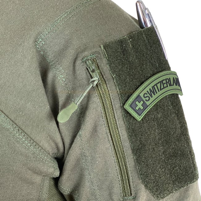 Auf den Seiten sowie unter den Armen weist es ein leichtes, weiches und luftdurchlässiges Maschengewebe auf, welches für die nötige Kühlung in heissen Situationen sorgt. Ebenfalls auf den Seiten finden sich beidseitig Taschen für ein Smartphone oder andere flache Gegenstände. Durchführungen ermöglichen ein verdecktes Verlegen von Kopfhörern oder anderen Kabeln. Auch die integrierten und mit einem YKK Reissverschluss versehenen Taschen auf den Oberarmen weisen beidseitig Kabeldurchführungen auf. Klett auf den Armen sowie auf der Brust ermöglicht das Anbringen von Namenspatches, Rangabzeichen, Funktionsabzeichen sowie anderen.