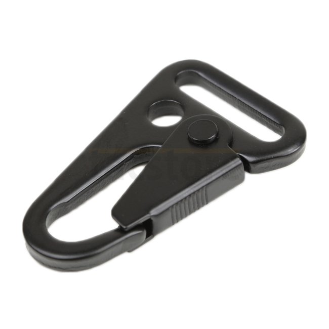 Dieser robuste HK Karabiner Haken aus pulverbeschichtetem Stahl passt mit seiner 25mm Riemenöse zu den meisten gängige Gewehrriemen mit 1-Inch Gewebeband. Zudem lässt sich mit zwei HK Karabiner Haken ein 2-Punkt-Riemen bei Bedarf einfach in einen Single-Point-Riemen verwandeln.
