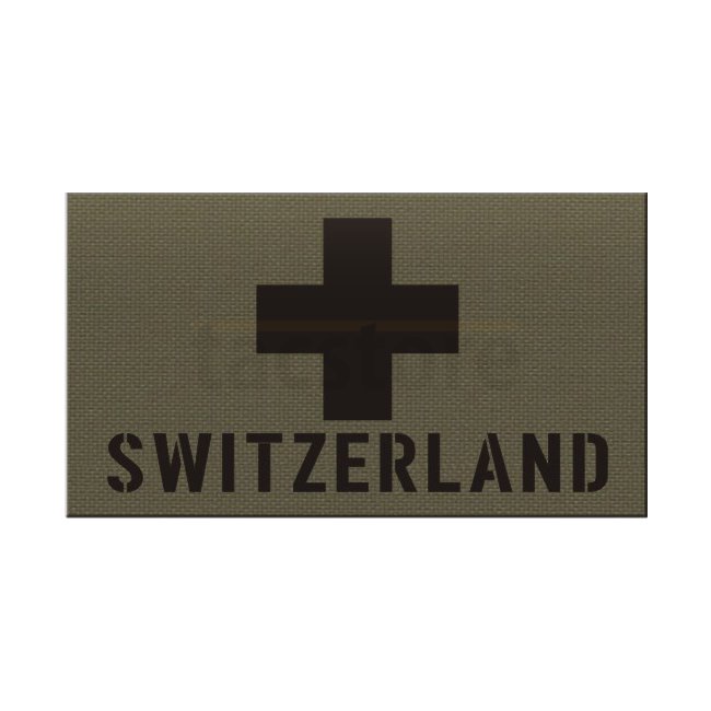 Heugabel Schweiz IR Druckflicken in Ranger Grün. Vorne: IR-Folie, bedruckt. Rückseite: Hakenfläche. Abmessungen: 90 x 50 mm.