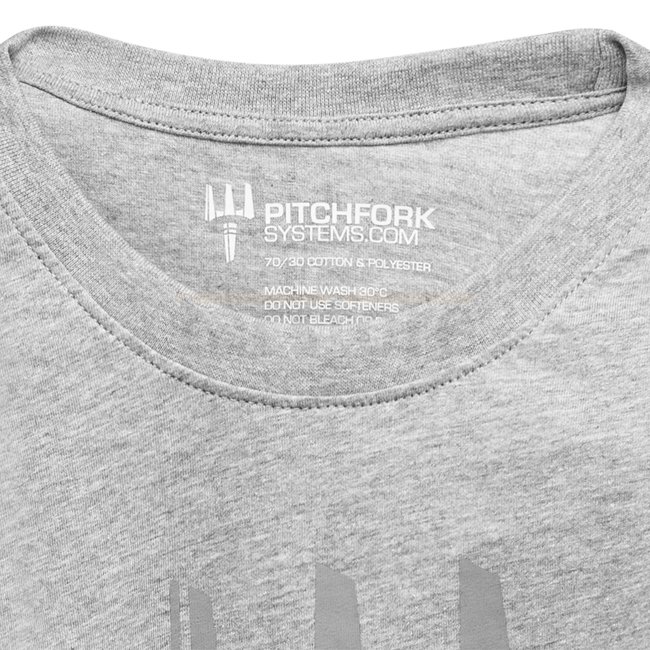 Pitchfork Trident Print T-Shirt in heather grau, Größe M. Großer Trident zentriert auf der Brust, kleiner Trident im Nackenbereich. Semi-eng geschnitten für eine gute Passform, hergestellt aus einer 50/30 Baumwoll-Polyester-Mischung. Bequemes, funktionale