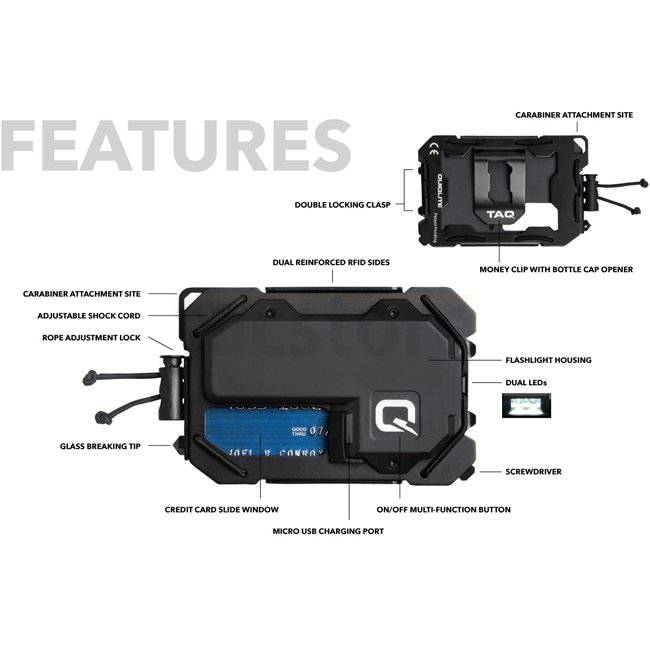 Besorgen Sie sich das QuiqLite TAQ Wallet in Schwarz - das ultimative taktische Portemonnaie mit USB-wiederaufladbarer LED-Taschenlampe, Sicherheitsblitzer, Flaschenöffner, Schraubendreher und mehr!