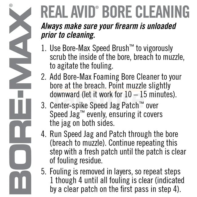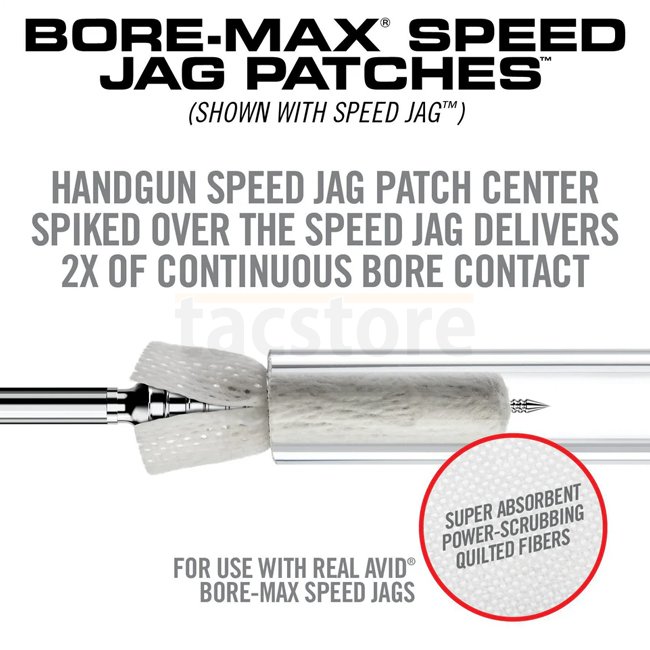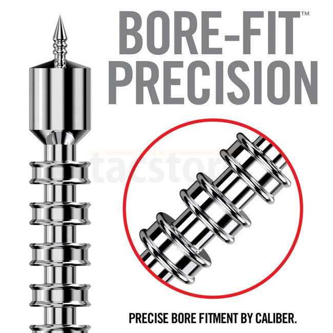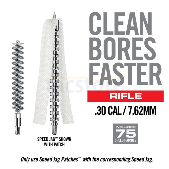Das System enthält eine Bore-Max Speed Brush mit doppelt so dichter Borstenanordnung wie herkömmliche Bürsten und vernickelte Phosphor-Bronze zur erhöhten Haltbarkeit. Der Speed Jag mit Kompressionsringen und die synthetischen Speed Jag Patches bieten bis zu viermal besseren Kontakt als traditionelle Jag-Patches. 75 Patches sind im Set enthalten.