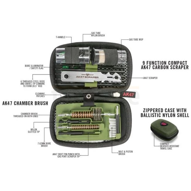 Große Funktionalität in einem kleinen robusten Paket, das problemlos in einen Rucksack oder einen Range Bag passt. Eine Kammerbürste, ein Kohleschaber, eine Gasrohrbürste und ein Wischmopp helfen dabei, mehr als nur die Bohrung zu reinigen und halten Ihren Bolzen zuverlässig am Laufen. Keine lästigen losen Teile, jede Komponente ist intelligent organisiert und sicher an Ort und Stelle gehalten. Stangenbasiert für eine einfachere Reinigung. Dies setzt den Standard für ein tragbares AK47-Reinigungsset.