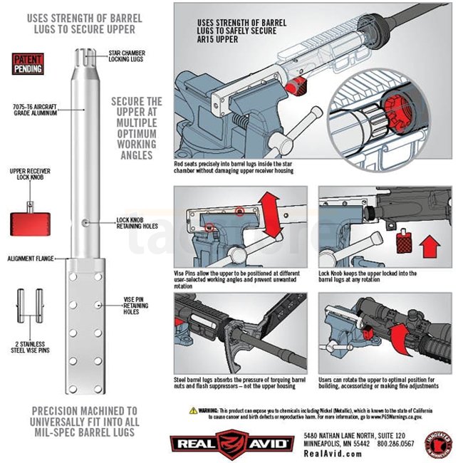 Herkömmliche Upper Blöcke im Klemmstil passen schlecht und können genug Druck nach innen ausüben, um das Gehäuse zu beschädigen, wenn ein Drehmoment auf eine Laufmutter oder eine Mündungsbremse ausgeübt wird. Das ist schlechtes Design. Also haben wir einen Upper Block entworfen, der den stärksten Teil der Waffe nutzt – die Laufansätze in der Sternenkammer. Der Lug-Lok ist präzisionsgefertigt und passt genau in alle Mil-Spec Upper. Es passt perfekt zu den Barrel Lugs, während Sie den Upper drehen um auf verschiedenen Seiten arbeiten zu können. Es gibt 2 Schraubstockstifte, mit denen Sie den Upper in mehreren Arbeitswinkeln halten und eine unerwünschte Drehung während der Anwendung mit hohem Drehmoment verhindern können. Der Verriegelungsknopf hält Lug-Lok in den Barrel Lugs. Das Ergebnis: die sicherste, einfachste und intelligenteste Art, einen AR15 Upper in einem Schraubstock zu befestigen. |