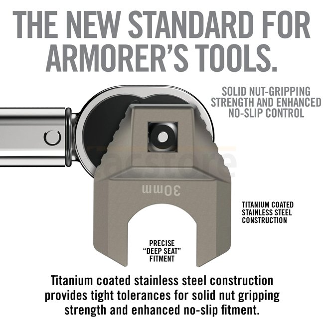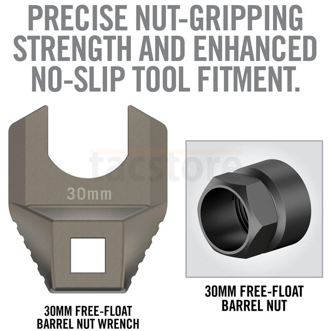Die Master-Fit 30mm Free-Float Barrel Nut Wrench wurde speziell für die präzise Montage entwickelt und ist darauf spezialisiert, Drehmoment auf 30mm Free-Float Barrel Nuts sicher zu übertragen. Die mit Titan beschichtete Edelstahlkonstruktion bietet enge Toleranzen für solide Muttern-Greiffestigkeit und verbesserte rutschfeste Werkzeugkontrolle. In Kombination mit der Master-Fit ½” Drive Torque Wrench hebt diese Kombination Ihr Waffenbauerlebnis auf ein ganz neues Niveau. Die Master-Fit Crowfoot ½″ Schraubenschlüssel funktionieren auch mit jedem Standard ½″ Antriebsschlüssel.