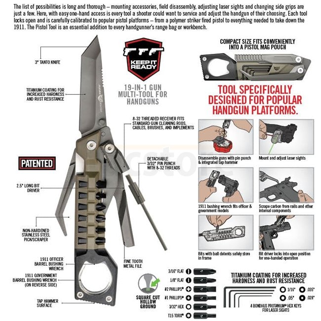 Die Liste der Möglichkeiten ist lang und umfangreich - Montage von Zubehör, Feld-Demontage, Justierung von Laservisieren und Wechseln von Griffen sind nur einige. Hier befindet sich mit einfachem Einhandzugriff jedes Werkzeug, das ein Schütze benötigen könnte, um die Waffe seiner Wahl zu warten und einzustellen. Jedes Werkzeug lässt sich öffnen und ist sorgfältig auf gängige Pistolenplattformen kalibriert. Das Pistolenwerkzeug ist eine unverzichtbare Ergänzung für den Range Bag oder die Werkbank jedes Schützen. |