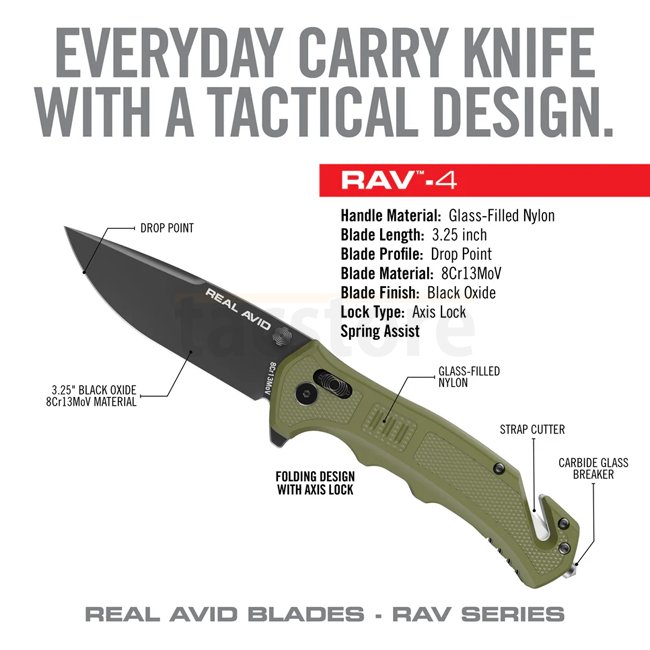 Das RAV-4 verfügt über eine 8,25 cm Drop-Point Klinge aus 8Cr13MoV-Stahl mit schwarzer Oxid-Beschichtung für besseren Korrosionsschutz und geringe Reflexion. Der Griff aus glasgefülltem Nylon bietet langlebige und leichte Kontrolle. Mit Axis-Lock-Verriegelung und Federn-Assist für schnelles Einhand-Öffnen, verfügt es über einen integrierten Schneidwerkzeug für Gurte und einen Karbid-Glasbrecher für Notfälle.
