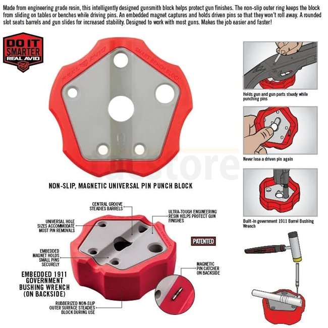 Dieser intelligent gestaltete Büchsenmacherblock aus technischem Harz trägt zum Schutz der Waffenoberflächen bei. Der rutschfeste Außenring verhindert, dass der Block beim Eintreiben von Stiften auf Tischen oder Bänken rutscht. Ein eingebetteter Magnet fängt und hält angetriebene Stifte, damit sie nicht wegrollen. Ein abgerundeter Schlitz nimmt Läufe und Waffenschlitten für erhöhte Stabilität auf. Entwickelt, um mit den meisten Waffen zu funktionieren. Macht die Arbeit einfacher und schneller!