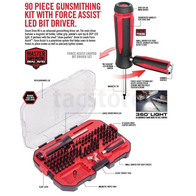 Smart Drive 90 ist ein fortschrittlicher Schraubenzieher für Büchsenmacher. Der Schraubenzieher verfügt über einen magnetischen Bithalter, einen Gummigriff, einen Juwelierkreisel und ein 360° LED-Licht. Er kann mit dem kleinen „Nahbereichs“-Schraubenzieher kombiniert werden, um Force Assist zu nutzen. Force Assist ist ein proprietäres System, das Benutzern hilft, festsitzende Schrauben zu lösen und Schrauben präzise anzuziehen. |