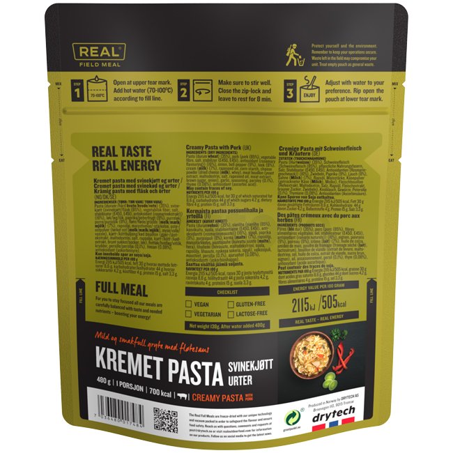 REAL Vollwertige Mahlzeit Cremige Pasta mit Schweinefleisch - Nahrhafte und leichte Mahlzeit, hergestellt für herausfordernde Bedingungen, 700 kcal pro Portion.