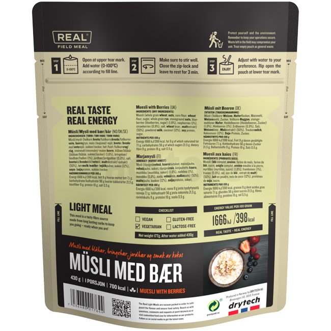 Um unter schwierigen Bedingungen arbeiten zu können, muss sichergestellt sein, dass die Ernährung ausgewogen ist und ausreichend Kohlenhydrate, Fett und Eiweiß enthält. REAL Field Meal wird von einem erfahrenen Team von Köchen zubereitet, um eine nahrhafte und leichte Mahlzeit zu sichern - einfach zuzubereiten und reich an natürlichem Geschmack.