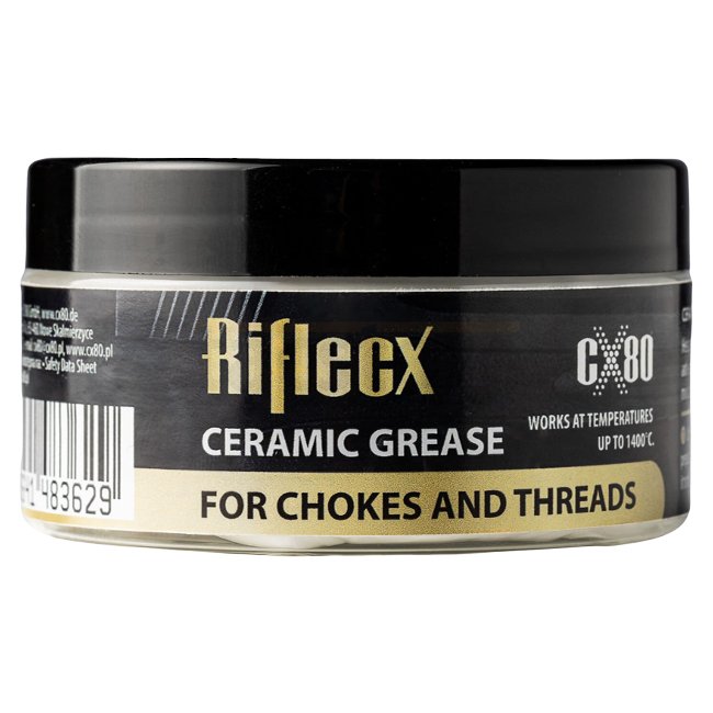 Das RifleCX-Keramikfett wird zur Wartung von Mündungsaufsätzen und Chokes an Feuerwaffen verwendet und widersteht Temperaturen von bis zu 1400 °C. Tragen Sie einfach nach der Reinigung des Gewindes Fett auf die Oberfläche auf, um ein Festfressen der Mündungsbremse zu verhindern. Durch die Verwendung von Fett auf den Gewinden und Mündungsaufsätzen können Sie auch zudem Verunreinigungen, Schmutz und Ablagerungen vorbeugen.