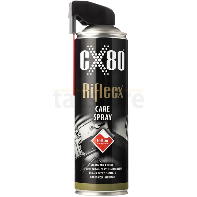 Der Rifle CX Teflon Gun Care Spray dient der Waffenpflege und wird nach der Reinigung der Waffe aufgetragen. Ein langer Applikator hilft Ihnen dabei, auch schwer erreichbare Stellen problemlos zu erreichen, sodass Sie das Mittel auf alle Teile Ihrer Waffe auftragen können. Nach dem Auftragen wird der Überschuss entweder mit einem sauberen Tuch abgewischt oder mit Druckluft weggeblasen. Idealerweise lässt man die Waffe jedoch lufttrocknen und lagert sie anschließend sachgerecht. Da das im Spray enthaltene Teflon konservierend wirkt, verdunsten beim Lufttrocknen die flüssigen Bestandteile und es bleibt die schützende Teflonschicht zurück. Diese Schicht schützt dann vor allem vor Korrosion, Abrieb und Verschleiß.
