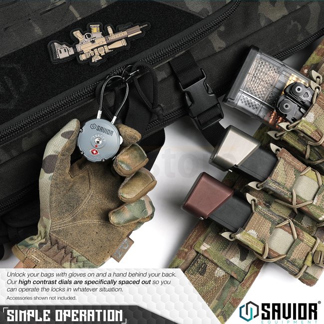 Kabelschloss mit 3-stelligem Zahlencode zur Sicherung von Taschen und harten Koffern. Von Travel Sentry® genehmigt. Gehäuse aus Zinklegierung mit 16-Gauge geflochtenem Stahlkabel. Passt zu allen verriegelbaren Reißverschlüssen von Savior Equipment. Abmess