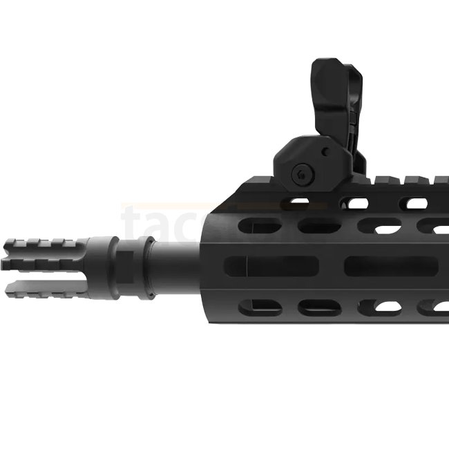 Die vollständig beidseitigen Bedienelemente, einschließlich des 45°/90° Sicherungshebels, verbessern die Benutzerfreundlichkeit für Rechts- und Linkshänder. Der Slim Line M-LOK Handschutz ermöglicht die Anbringung verschiedener Zubehörteile, während der Schubschaft Anpassungsfähigkeit und Komfort während des Gebrauchs bietet.