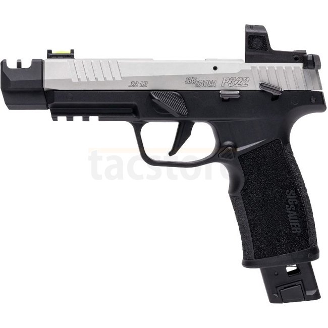 Die SIG Sauer P322-COMP ist eine wettkampforientierte .22 LR Pistole, die entwickelt wurde, um Ihr Schießerlebnis zu verbessern. Basierend auf der ursprünglichen P322-Plattform bietet die P322-COMP verbesserte Funktionen, die auf Präzision und Leistung ausgerichtet sind. Sie wird ab Werk mit einem ROMEOZero Elite 3 MOA Rotpunktvisier geliefert, das eine schnelle Zielerfassung und verbesserte Schussgenauigkeit ermöglicht. Die Pistole ist mit einem laufmontierten Kompensator ausgestattet, um das Hochschlagen des Laufs zu reduzieren und schnellere Folgeschüsse zu ermöglichen. Weitere benutzerfreundliche Merkmale sind ein auf dem Schlitten montierter Racker, ein Sportzerlegehebel, beidhändige Bedienelemente und austauschbare flache und gebogene Abzugsschienen. Das Fiberoptik-Korn ergänzt das Rotpunktvisier und sorgt für eine schnelle Zielausrichtung.