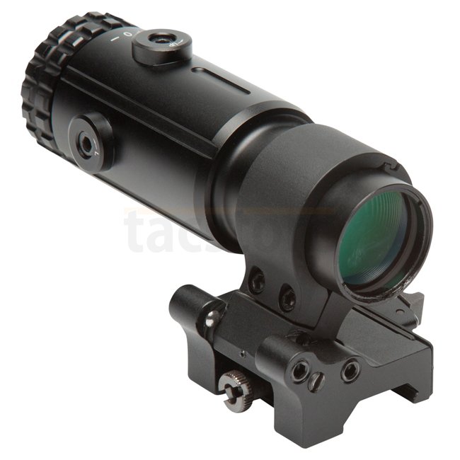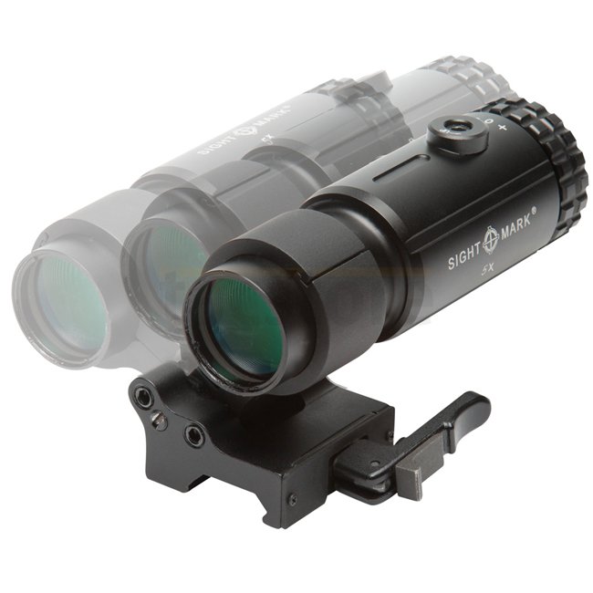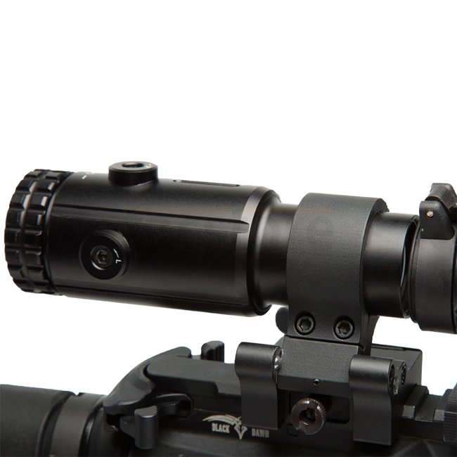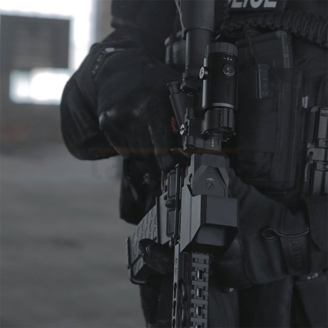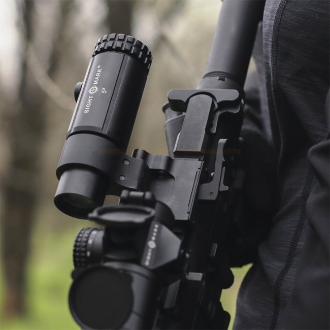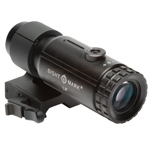 Der Sightmark T-5 ist ein Vergrösserungsaufsatz, der hinter einem Reflexvisier oder einer Rot-Punkt Zielhilfe montiert wird und bei einem AR15 auf gleicher Höhe mit dem Korn liegt (sog. Absolute Co-Witness). Ändern Sie die Vergrößerung Ihrer Nahbereichsoptik im Handumdrehen von 1x auf 5x, indem Sie die seitliche Halterung des T-5 verwenden. Das schlanke Design des Magnifiers verhindert, dass sich Kleidung und Ausrüstung verfängt. Die mitgelieferte LQD-Halterung ist ideal um das Einsatzspektrum auf 200 Meter aus zu dehnen. Die Aluminiumkonstruktion des T-5 ist stoßfest bis zum Kaliber .308 und bietet einen wasserfesten Schutz nach IP55. Helligkeit und Auflösung werden durch vollständig mehrfachvergütete Optiken verbessert. Die Seiten- und Höhenverstellung hilft Schützen, das Absehen ihres Rotpunkt- / Reflexvisiers mittig auszurichten. Der Sightmark T-5 wird mit der LQD-Halterung, Einstellwerkzeuge sowie der Bedienungsanleitung geliefert.