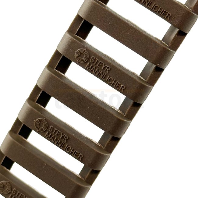 Steyr Picatinny Schienenabdeckung in Olivfarbe schützt Schienenabschnitte, bietet Griff und Komfort. Schützt vor Stößen, einfach zu installieren, langlebiges Polymermaterial.