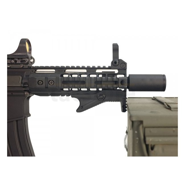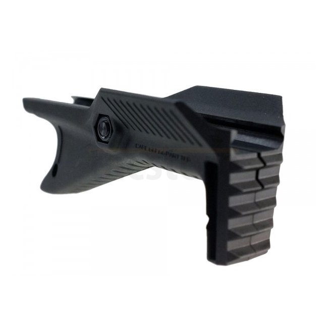 Der Cobra Griff ist aus einem hochwertigen Polymer entwickelt, welches ordentlich was wegstecken kann. Der Schütze kann verschiedene Grifftechniken anwenden was es dem Benutzer ermöglicht, einen sicheren und komfortablen Halt zu haben, in jeder Situation oder Position. Der Griff verfügt über eine geriffelte Frontseite mit der man das Gewehr gegen einen Tisch oder an einer Wand abstützen kann und weil sie gerillt ist, wird sich die Waffe auch nicht durch den Rückstoss verschieben.