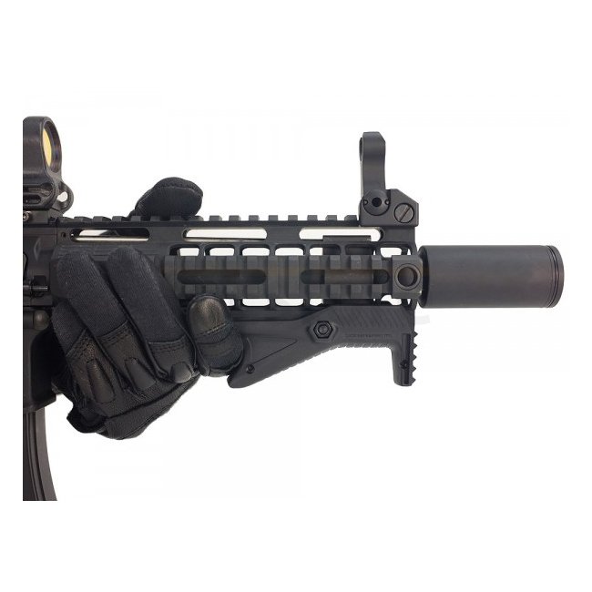 Eine weitere Besonderheit ist die Cobra "Haube". Sie wirkt wie ein Hitzeschild das die Wärme von der Führhand fern hält und dient gleichzeitig als ergonomische Plattform. Der hintere Teil des Cobra Grips kann als Hand-Stopper funktionieren. Ein weiterer Vorteil den der SI Cobra Grip gegenüber seinen Konkurrenten hat, ist die Friktionsarretierung: In der Mitte wurde bewwusst Material entfernt, so dass sich beim Festziehen der Schraube der Griff fest in der Schiene verankert, womit jegliches Wackeln eliminiert wird. Der Strike Industries Cobra Griff ist schlank und weist ein schmales Profil auf, was ihn sehr leicht macht.