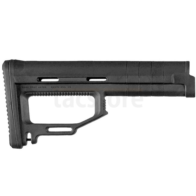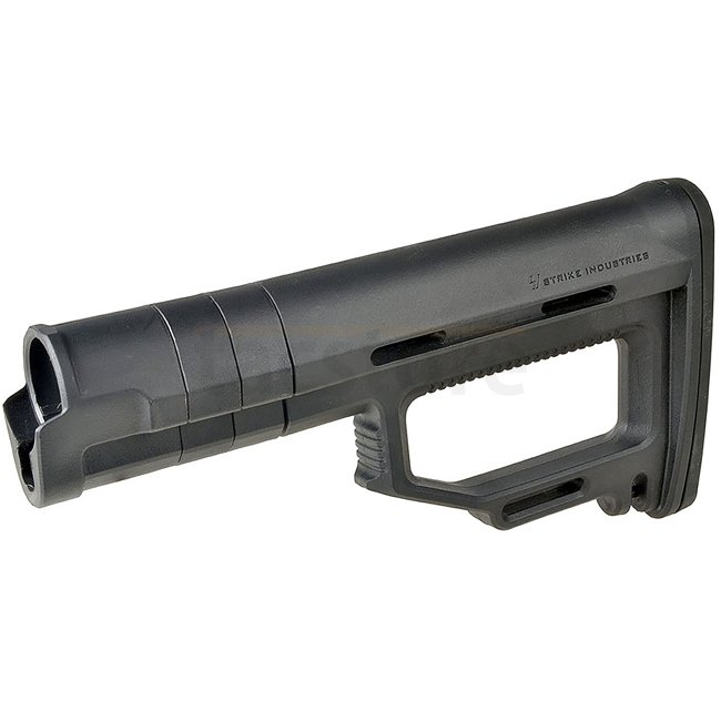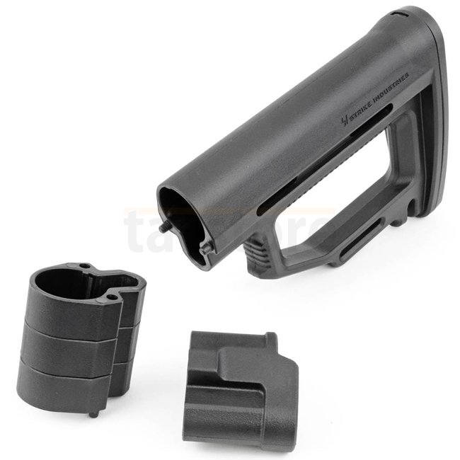 Strike Industries Modular Fixed Stock in Schwarzfarbe. Einfach einstellbar mit dem mitgelieferten Shim-Set. Leichtgewichtig mit 363g, kompatibel mit mil-spec Karabiner oder Strike Industries Advanced Receiver Extension Pufferrohren. Passt mit MFS Extended