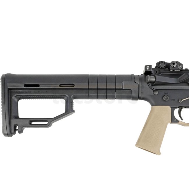 Einstellbarer Strike Industries Modul-Festschaft in Dunkelerde-Farbe mit 3 Verstellplättchen. Material aus Polymer/Stahl, Abmessungen 229-285x44x130mm, Zuglänge 30,5-36cm, Gewicht 363g. Kompatibel mit mil-spec Karabiner oder SI Advanced Receiver Extension