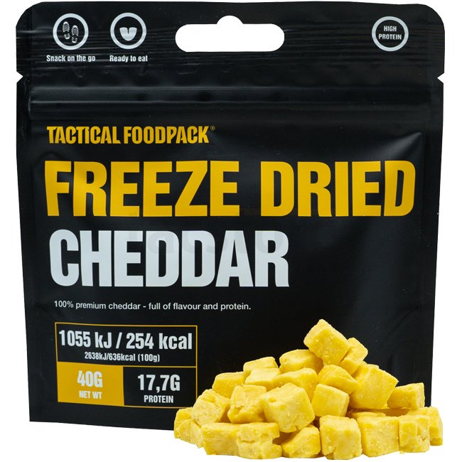 Die Tactical Foodpack Freeze Dried Cheese Bites stillen deinen Salzhunger und sind eine gute Kalzium- und Proteinquelle. Eine tolle Abwechslung zu den