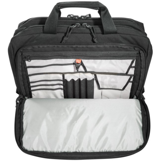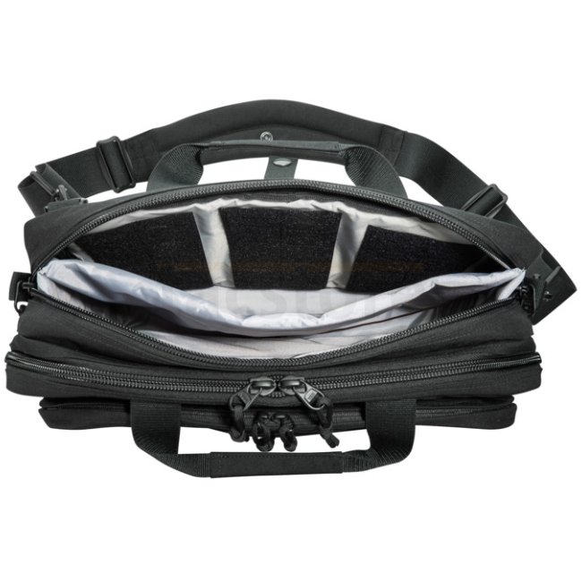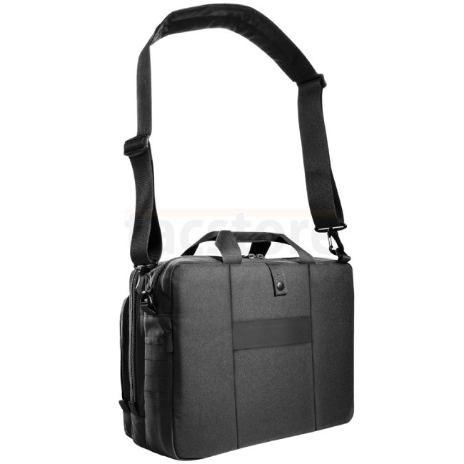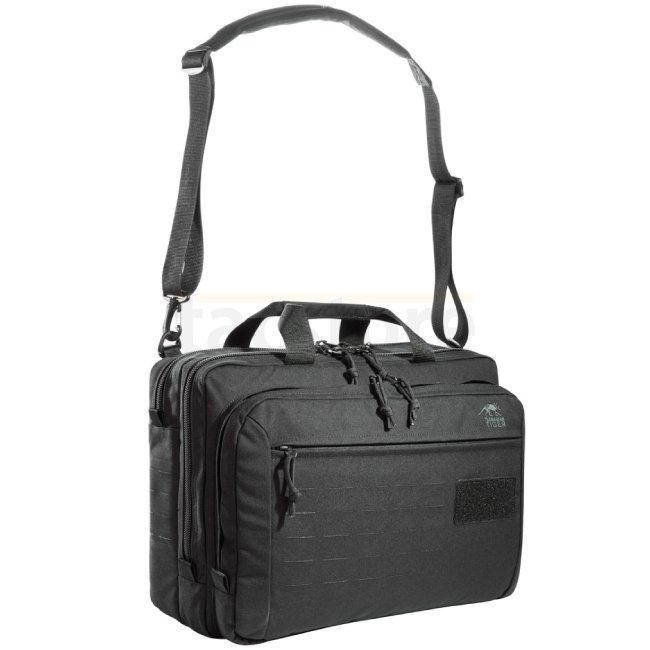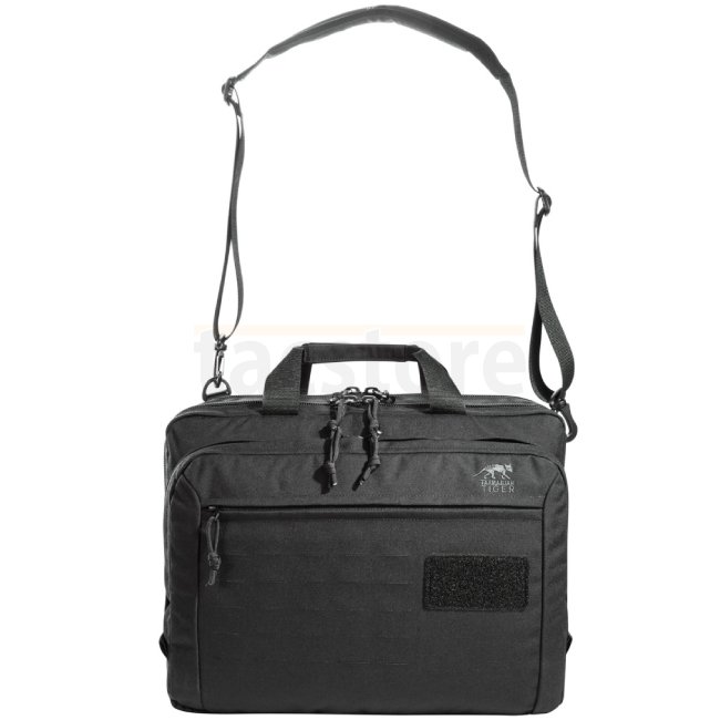 Geräumige Tasmanian Tiger Dokumententasche MK II in Schwarz für Laptop, Ordner & Dokumente. Mit MOLLE Klettverschluss, 15,4" Laptopfach, laser-geschnittenem MOLLE, gepolstertem Schulterriemen, 18L Volumen, Cordura 700D Material.