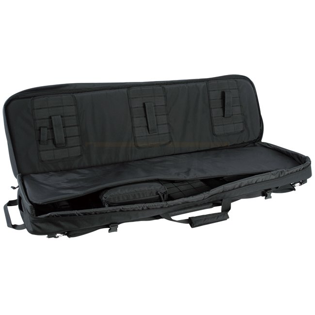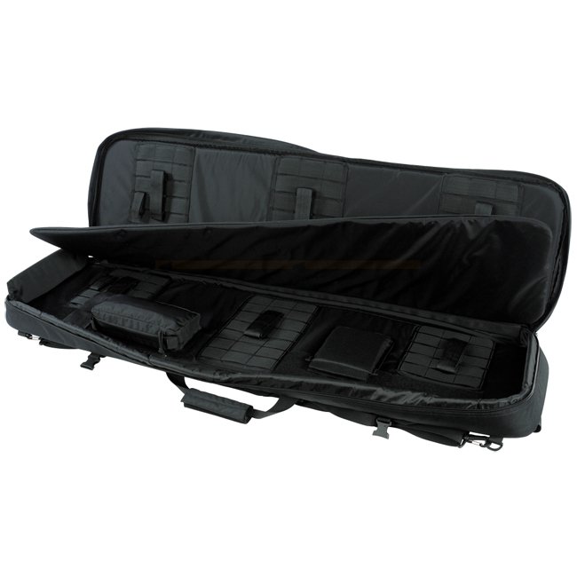Einsteckbare Schultergurte auf der Rückseite; Abnehmbarer Tragegurt; Zwei Tragegriffe (horizontal und vertikal); Herausnehmbare Innentasche; Gepolsterte Seitenteile; Zwei separate Aussentaschen mit Unterteilungen; MOLLE-System auf der Vorderseite; Herausnehmbares Trennpolster zwischen den Waffen; Abnehmbare Verlängerung für extrem lange Waffen