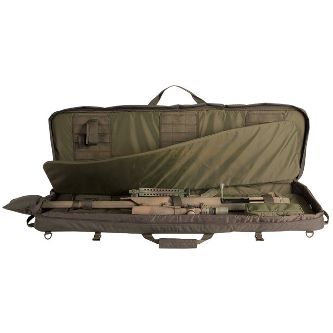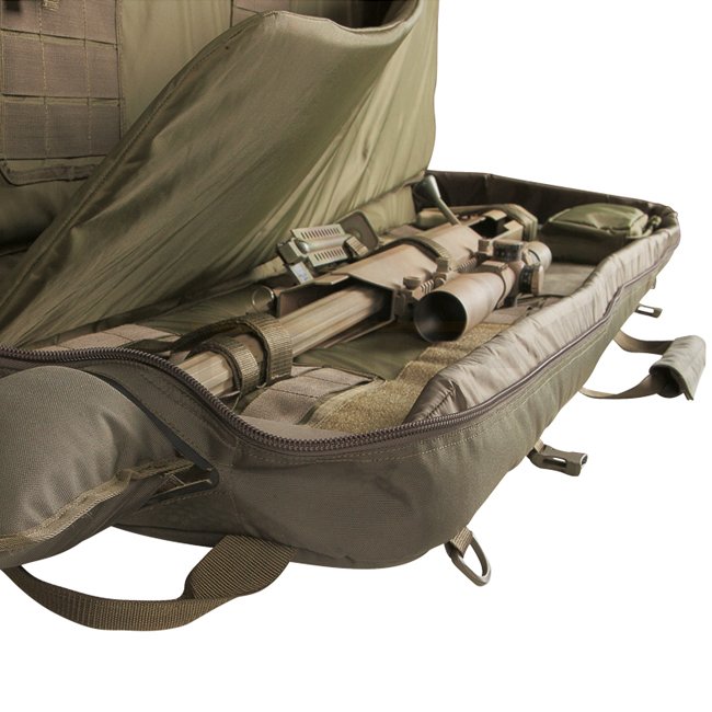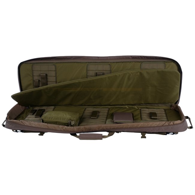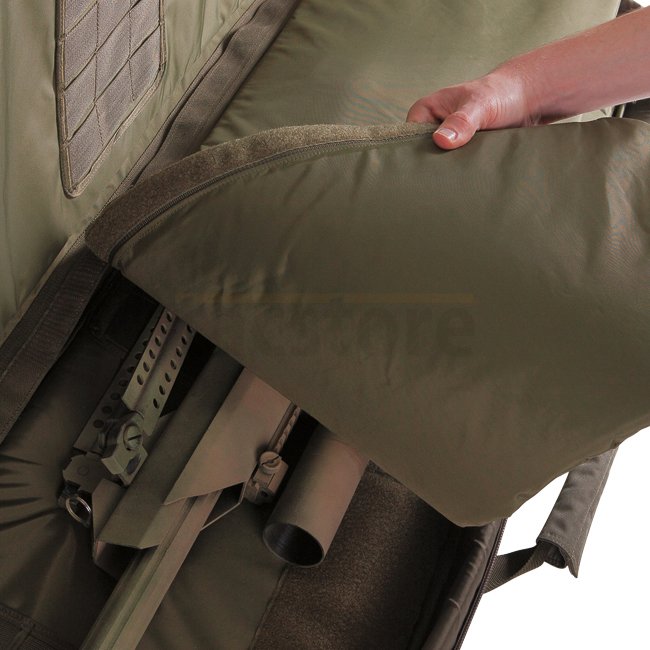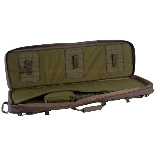 Einsteckbare Schultergurte auf der Rückseite; Abnehmbarer Tragegurt; Zwei Tragegriffe (horizontal und vertikal); Herausnehmbare Innentasche; Gepolsterte Seitenteile; Zwei separate Aussentaschen mit Unterteilungen; MOLLE-System auf der Vorderseite; Herausnehmbares Trennpolster zwischen den Waffen; Abnehmbare Verlängerung für extrem lange Waffen