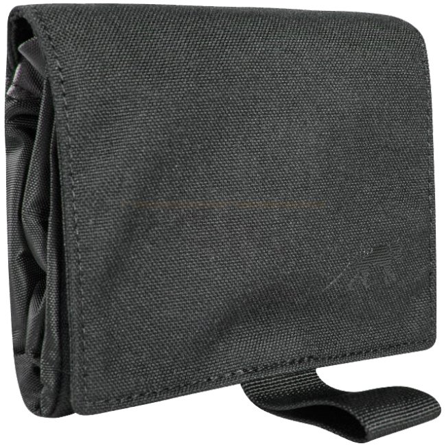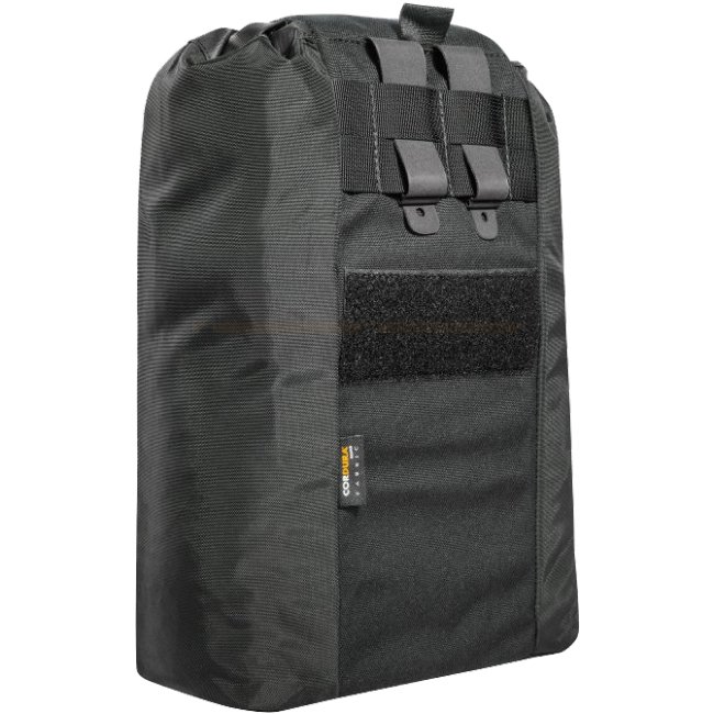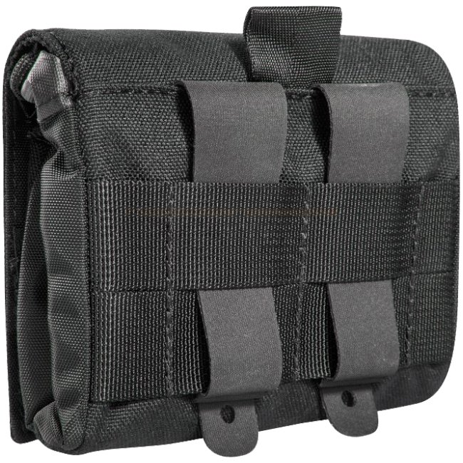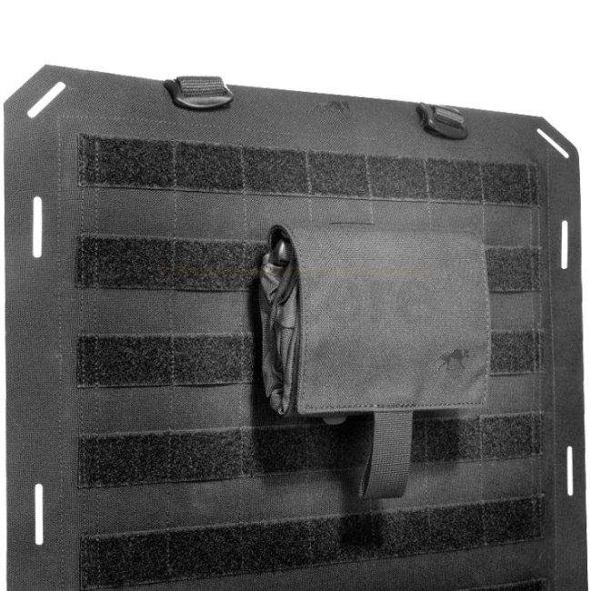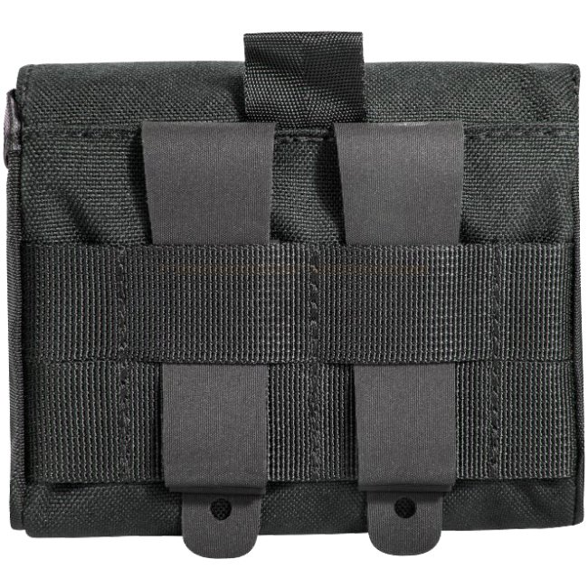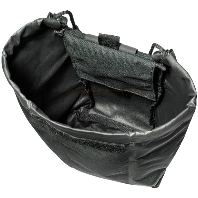 Kompakte Tasmanian Tiger Dump Pouch MK II in Schwarz, hergestellt aus strapazierfähigem 100% CORDURA-Material. Verfügt über 4 Taschen in 3 Größen, ein packbares Design, Einhandbedienung und ist kompatibel mit 6 x G36 Doppelmagazinen. MOLLE-Rückwand für ei