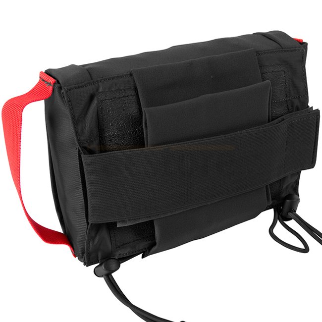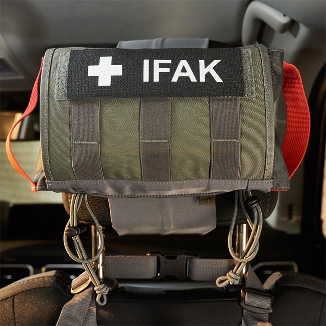 Erste-Hilfe-Set mit Schnellzugriffssystem. Befestigung am Kopfstützen des Autositzes, mit abnehmbarem Panel und konfigurierbaren Schlaufen. TacVec-Serie. Abmessungen: 19 x 14 x 5 cm. Hergestellt aus CORDURA 700 den. Ausgestattet mit Klettverschluss, IFAK-