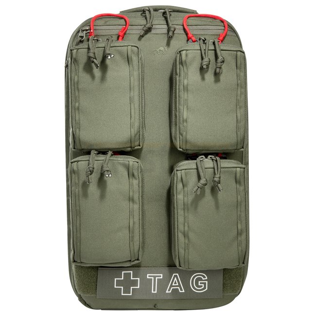 Der Tasmanian Tiger Medic Mascal Pack in Olivfarbe ist ein spezialisierter Rucksack, der für die Erstbehandlung von Verletzten in Massenunfallsituationen verwendet wird. Er zeichnet sich durch ein funktionales Design mit vier IFAK-Taschen an der Vordersei
