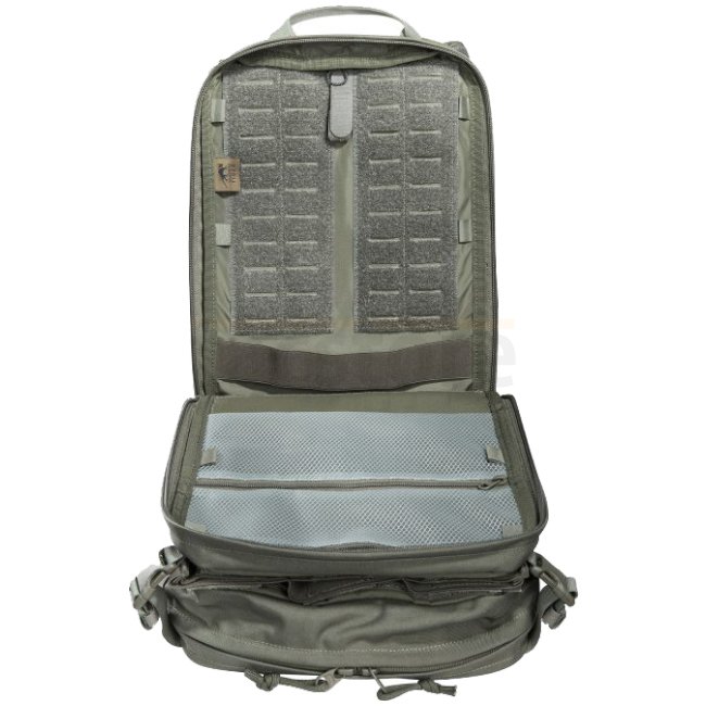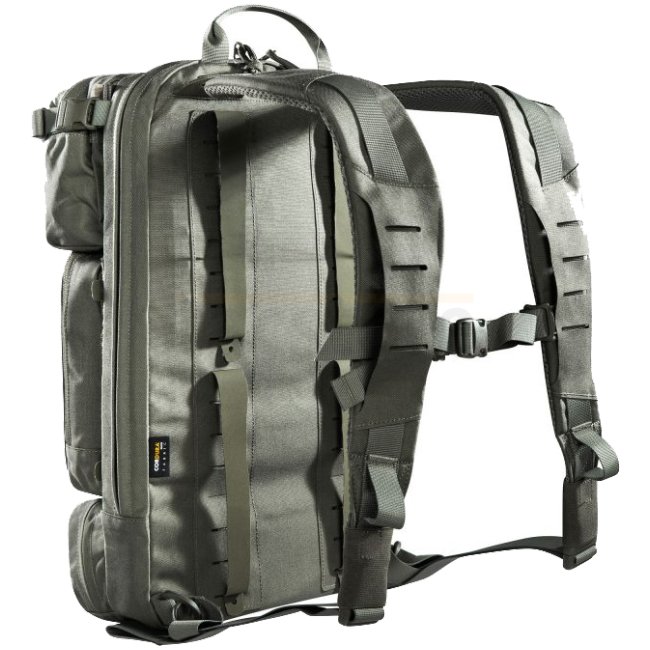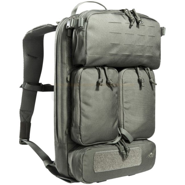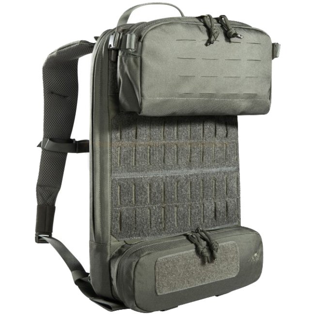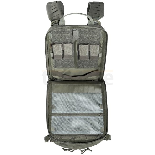 Leichter, taktischer Einsatzrucksack für die modulare Nutzung. Durch das verwendete Material ist dieser Einsatzrucksack sehr leicht und somit äußerst komfortabel zu handhaben. Er besitzt ein flaches Hauptfach, das mit einer Trinksystemvorbereitung versehen und dessen Rückwand mit MOLLE-Klett zur individuellen Bestückung belegt ist. Die obere Fronttasche des Rucksacks lässt sich abklappen, dahinter kann ein Magazinhalter (drei M4-Magazine oder 4 Pistolen-/ MP7-Magazine; im Lieferumfang enthalten) angeklettet werden. Die beiden mittleren Fronttaschen lassen sich abnehmen, dahinter befindet sich eine MOLLE-Klettfläche. An der unteren Fronttasche können die TT Tac Pouch 12 (Art. 7862) oder die TT 2 SGL Backup Mag Pouch M4 (Art. 7811) befestigt werden. Der Rucksack ist auf der Rückseite mit einem MOLLE-Reverse System versehen, um ihn auf Plattenträgern einfädeln zu können. Auch eine Befestigung auf Plattenträgern per Adapter ist möglich.