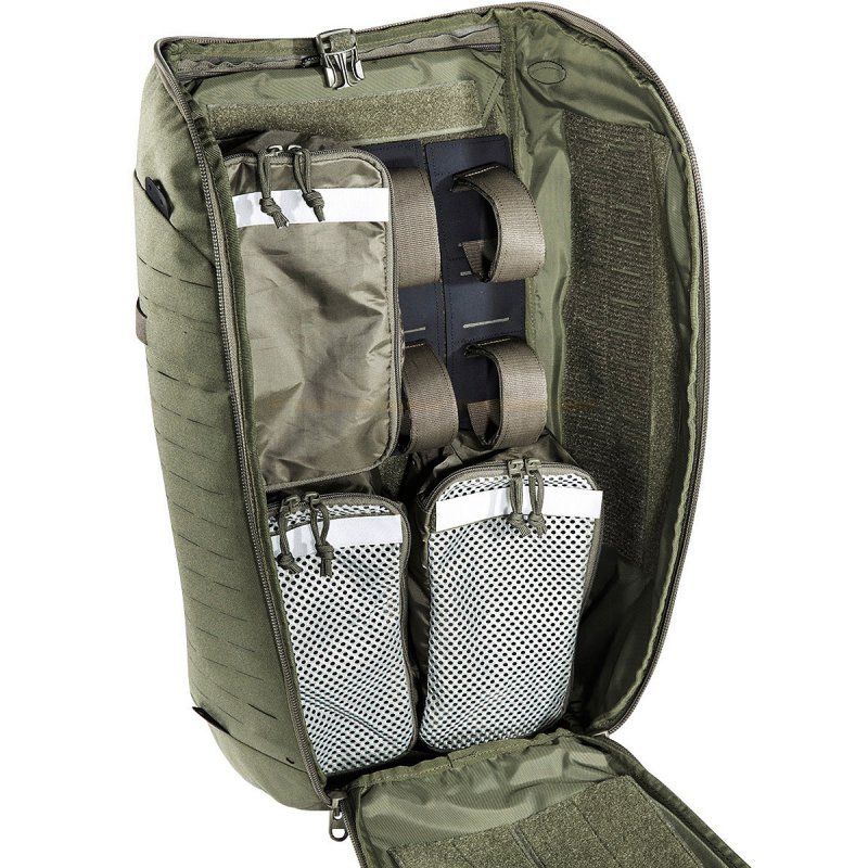 Modularer, universaler Einsatzrucksack mit abnehmbarem Deckel. Die Frontöffnung dieses Einsatzrucksacks lässt sich komplett aufziehen, der Deckel ist in der Höhe verstell- sowie abnehmbar. Der Rucksack besitzt eine Deckeltasche und ist an den Seiten und auf der Front mit MOLLE in Laser Cut-Ausführung versehen. Zudem verfügt er über eine abnehmbare Falttasche auf der Front. Die Innenseiten sind zur individuellen Ausstattung mit Klettflächen versehen. Der abnehmbare Hüftgurt kann auch separat als Warrior Belt verwendet werden. Auslieferung mit drei eingekletteten Zubehörtaschen und einer eingekletteten Waffenhalterung.