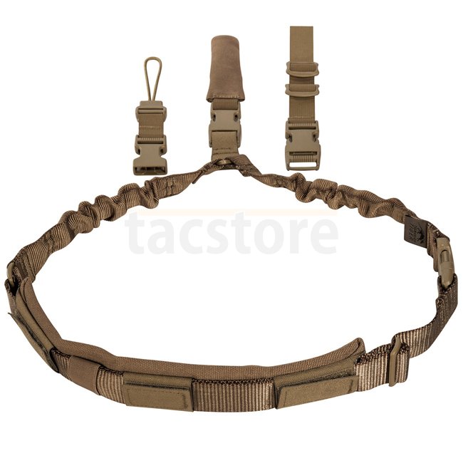 Gepolsterter Single-Trageriemen mit verschiedenen Befestigungsoptionen. Per Steckschließe kann entweder ein Waffenhaken, ein Band für Riemenösen oder eine 3-mm-Reepschnur für Kameras (2 Strings à 3 mm Durchmesser) angebracht werden. Die maximale Belastung der Kameraaufhängung beträgt 85 Kilogramm, und sie sollte ausgetauscht werden, wenn der innere weiße Kern sichtbar wird.