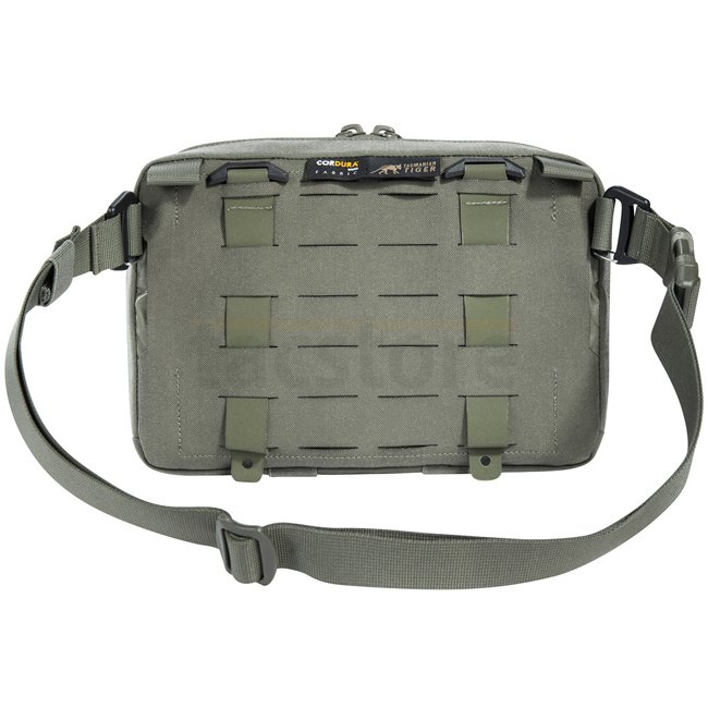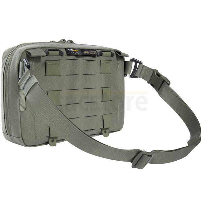 Die Tasche verfügt über ein abnehmbares MOLLE-Reverse-System zur Befestigung auf Plattenträgern und an Rucksäcken. Zudem kann sie mit Schlaufen am TT Survival Pack oder anderen MOLLE-Flächen mit entsprechenden Schnallen eingehängt werden. Auch ein Durchlass für eine 50 mm-Gürtelschlaufe ist vorhanden. Innen befinden sich flache Netztaschen, elastische Schlaufen und eine große MOLLE-Klettfläche.