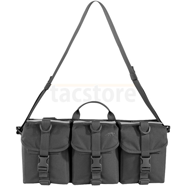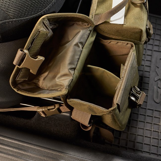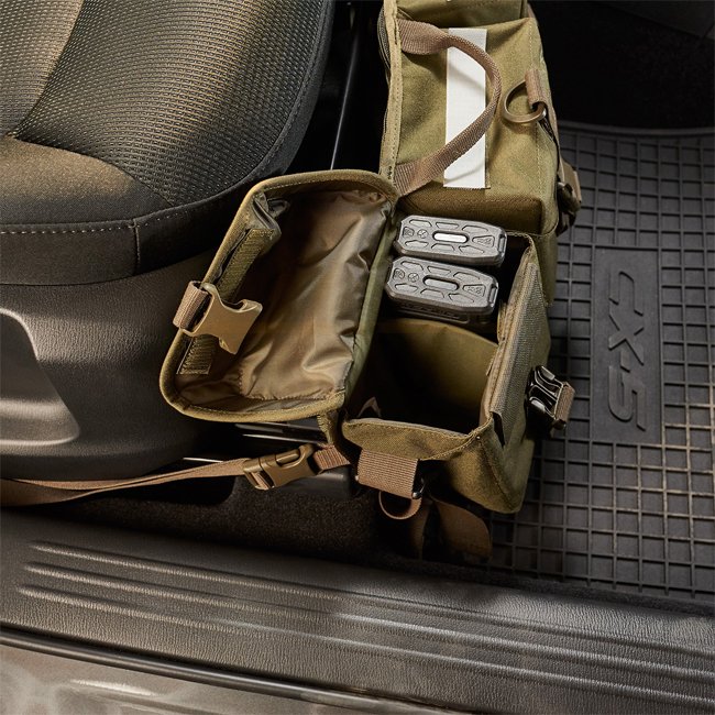 Dreigeteilte Taschenvariante, die vor dem Vordersitz des Fahrzeugs befestigt wird. Die Tasche kann im Notfall als Bandolierensystem verwendet oder am Handgriff schnell aus dem Fahrzeug entfernt werden. Bestandteil der TacVec-Serie.
