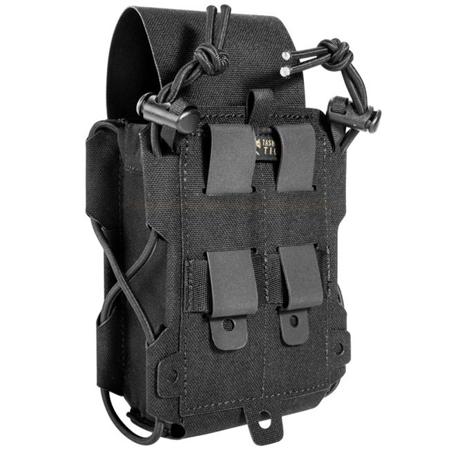Kompakte Tasmanian Tiger Universal Tasche M in elegantem Schwarz, ideal für Magazine, GPS, Funkgeräte und Wasserflaschen. Hergestellt aus strapazierfähigem CORDURA® 700D / T-Stretch Material. Wiegt nur 100g, mit Abmessungen von 17 x 10 x 7cm.