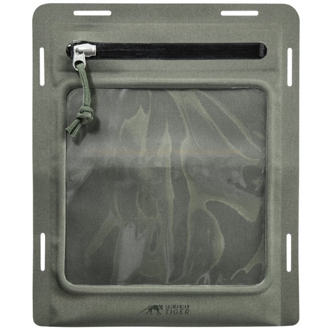 Tasmanian Tiger W-Pouch A5 WR - Stone Grey Olive: Wasserfeste Tablethülle mit Molle-Klettadapter. 420D Nylon TPU Eco, 26x22cm. Reißverschluss, nicht vollständig wasserdicht.