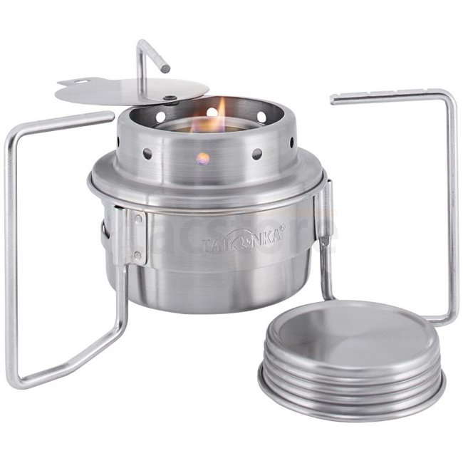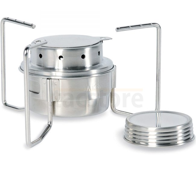 Spirituskocher Tatonka Burner Set - kleiner Spirituskocher mit kompaktem Brenner, integriertem Flammenregler und vierteiligem Ständer. Brenner (Ø 7,5 x 5,5 cm, 95 g), Flammenregler (Ø 7,65 x 2,5 cm, 30 g), Ständer für den Spiritusbrenner (7,5 x 3 cm, 85 g