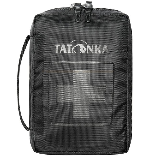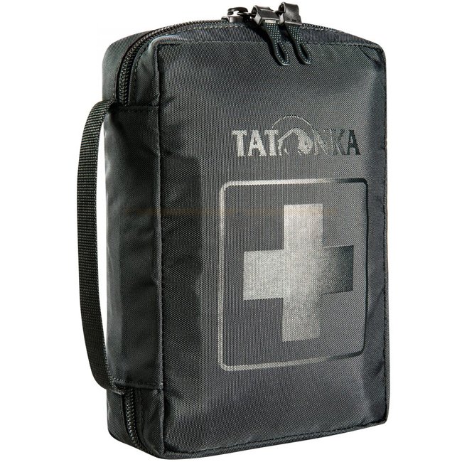 Erste-Hilfe-Tasche Tatonka First Aid in Größe S (18 x 12,5 x 5,5 cm) mit umlaufenden Reißverschluss, Handtragegriff und unterteiltem Hauptfach (ohne Inhalt).