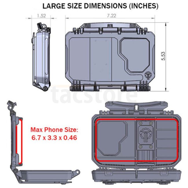Während das ursprüngliche DarkVault® Thyrms Allzweck-Case für empfindliche Ausrüstung bleibt, ist das DarkVault 2.0 Critical Gear Case speziell für die Smartphone-Nutzung in rauen Umgebungen konzipiert. Befestigen Sie das DarkVault 2.0 einfach an Ihrem Plattenträger oder Chest Rig um einfachen und schnellen Zugriff auf Ihr Gerät für Navigation, Ballistikinformationen, Kommunikation oder andere Zwecke zu haben. Thyrm hat das DarkVault 2.0 und das Sichtfenster zudem so konzipiert, dass dieses mit den meisten Smartphones auf dem Markt mit normalen Handyhüllen funktionieren.
